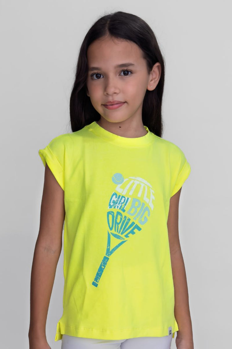 Conoce nuestra camiseta Big Drive, en un color amarillo neón que se destaca en la cancha. Su estampado original en forma de raqueta le añade un look dinámico y divertido.