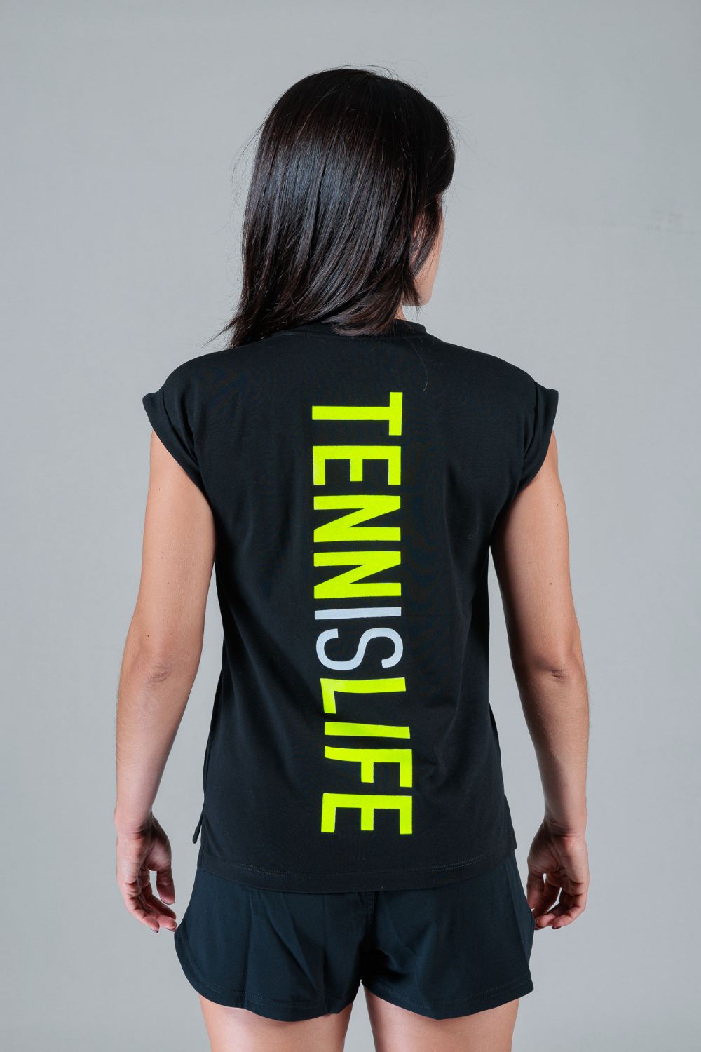Te presentamos nuestra camiseta TennisLife, es un bestseller de la marca Forty Love por su mensaje y estampado en la espalda con los colores neón que contrastan con el tono negro.