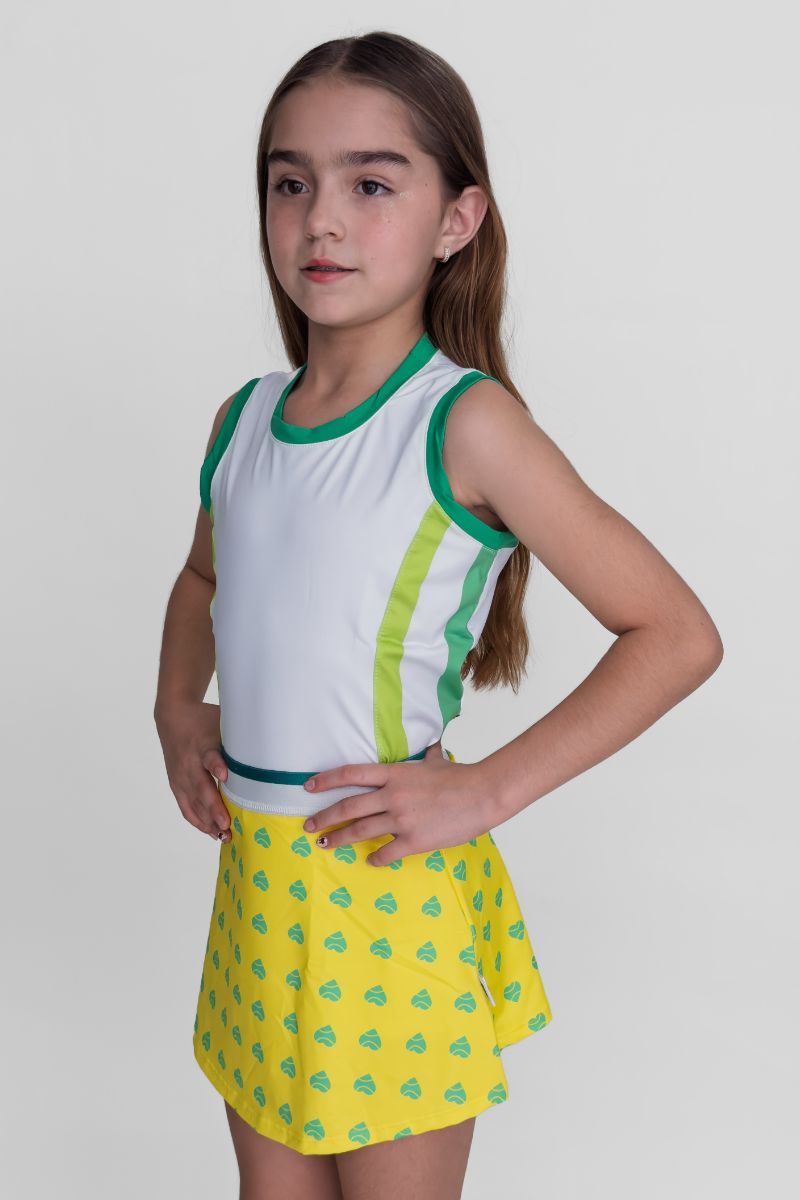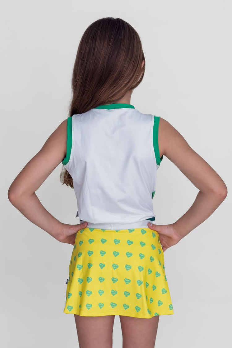 El set corazones es el ideal para esos días de partido o torneo de tenis donde quieres ganar con solo pisar la cancha. Tu rival quedará impactada con este increíble diseño. La falda contiene detalles estampados inspirados en pequeños corazones formados a partir de la bola de tenis, que expresan el amor y el orgullo que sientes al practicar este deporte. Su contraste de falda amarilla con blusa verde forman la combinación perfecta.